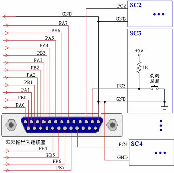 系統配線圖(請注意:PA,PB,PC各腳皆應接一只1K拉升電阻至+5V)